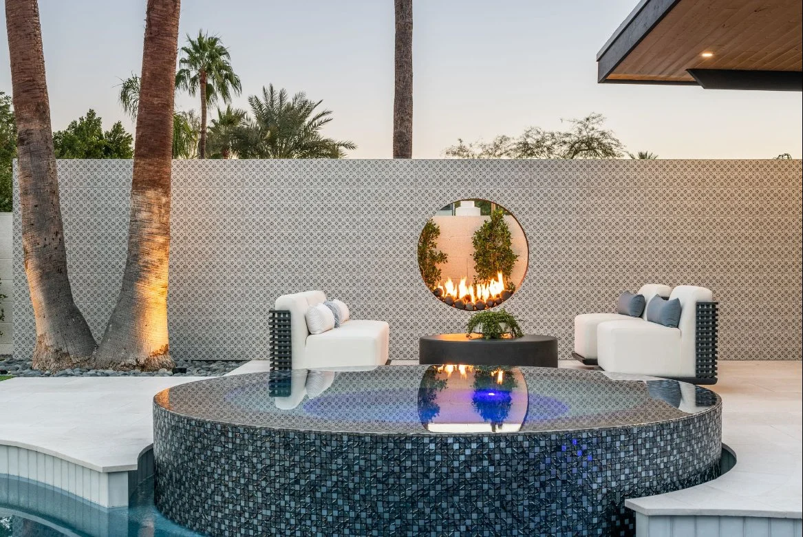 – A poolside fire feature reflecting in water, grounding the balance of the entire space.
